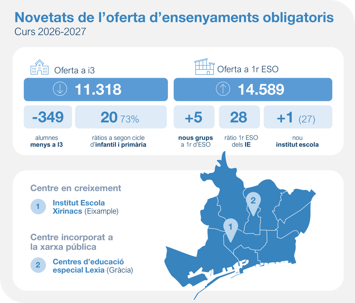 L’oferta inicial de places per al curs 2026-2027 a i3 és d’11.318, de les quals 5.555 són places a centres públics i 5.763 són places a centres concertats. A primer d’ESO s’incrementa l’oferta amb un total de 14.589 places repartides en 5.948 a centres públics i 8.641 en concertats.
